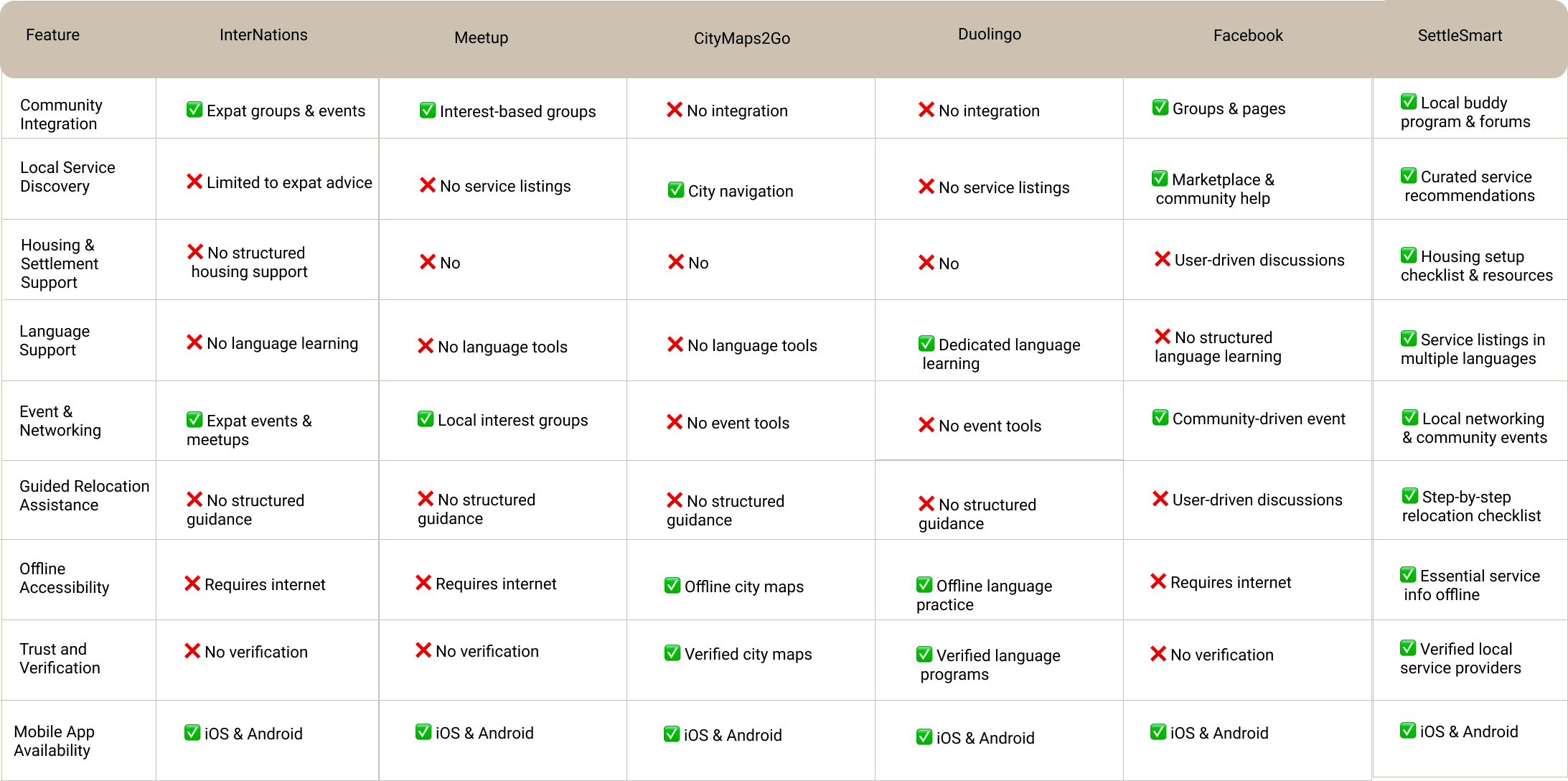 SettleSmart operates in the relocation assistance and community integration space, competing with platforms that provide networking, local service discovery, and adaptation support for newcomers. The analysis covers direct competitors (offering relocation-focused services), secondary competitors (providing adjacent services like local networking), and indirect competitors (offering supplementary tools such as language learning).
